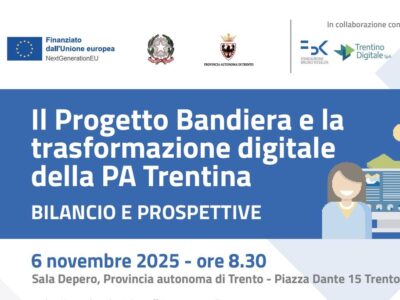 Una mattinata dedicata all’innovazione digitale nella pubblica amministrazione trentina. Giovedì 6 novembre, a partire dalle 8.30 nella Sala Depero del Palazzo della Provincia, si terrà l’incontro “Il Progetto Bandiera e la trasformazione digitale della PA trentina: bilancio e prospettive”, un momento di confronto per fare il punto sui risultati raggiunti dalle progettualità e sulle nuove opportunità aperte dalle tecnologie emergenti - in particolare dall’intelligenza artificiale - nel settore pubblico.